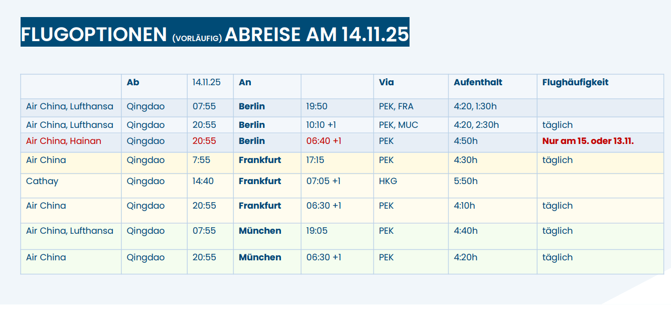 Hier finden Sie das Ergebnis unserer Recherche für mögliche Flüge für die DCKN mit den Abflugmöglichkeiten Berlin, Frankfurt und München. Bitte beachten Sie, dass sich die Verfügbarkeit der Verbindungen in der Zwischenzeit geändert haben könnte.