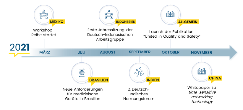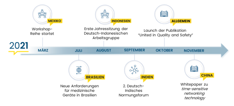 Ministerien und Behörden, Industrie, Wissenschaft und QI-Institutionen aus Deutschland und den Partnerländern nahmen im Jahr 2021 an mehr als 45 Workshops und Arbeitsgruppensitzungen teil. Gemeinsam leisteten sie einen Beitrag zur weltweiten Harmonisierung von Qualitätsinfrastrukturen (QI).