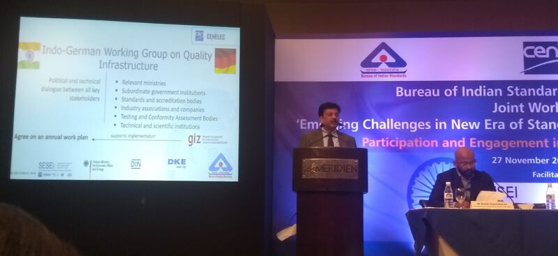 The country component India of the Global Project Quality Infrastructure (GPQI) presented the Indo-German Working Group on Quality Infrastructure on behalf of the German Federal Ministry for Economic Affairs and Energy (BMWi) and the German standardisation bodies DIN and DKE. The presentation highlighted the relevance of harmonising national standards with international standards to reduce technical barriers to trade and how the activities of the project contribute to that.