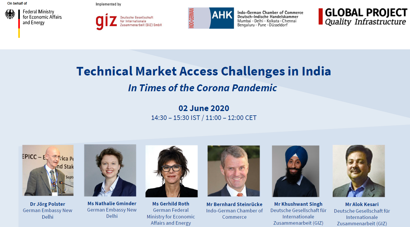 The Global Project Quality Infrastructure (GPQI) in cooperation with the German Embassy and the Indo-German Chamber of Commerce (IGCC) organised an online exchange on “Technical Market Access Challenges in India - In Times of the Corona Pandemic” on 2 June 2020. The online exchange was attended by around 60 experts and representatives of German companies operating in India.