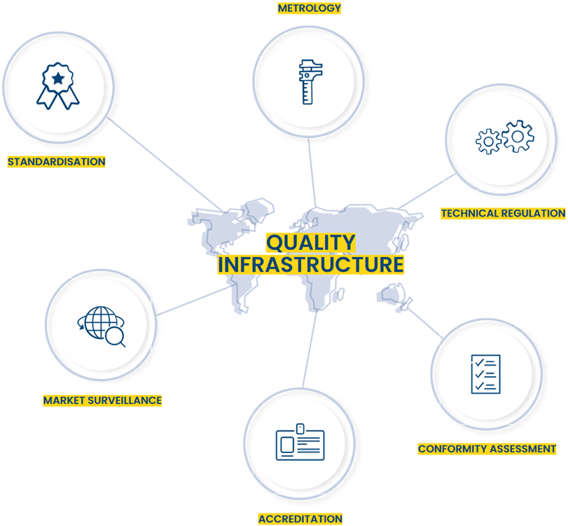 Quality infrastructure is the system put in place to ensure products and services are safe and of high quality. It covers everything from standardisation and conformity assessment (testing, inspection and certification) to accreditation, metrology and market surveillance.