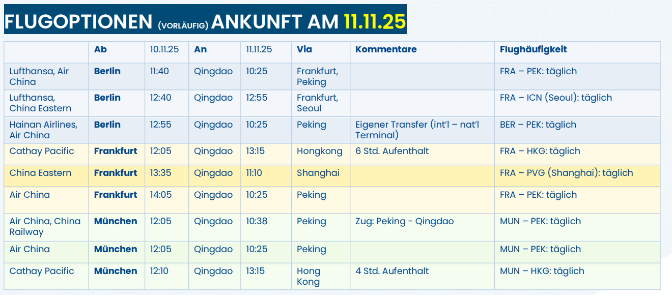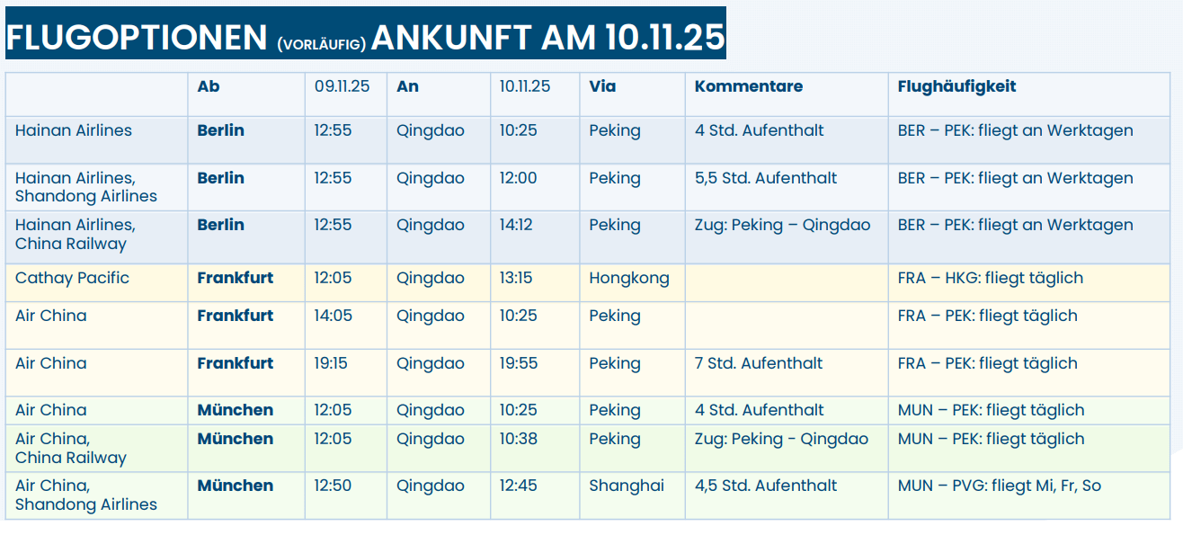 Hier finden Sie das Ergebnis unserer Recherche für mögliche Flüge für die DCKN mit den Abflugmöglichkeiten Berlin, Frankfurt und München. Bitte beachten Sie, dass sich die Verfügbarkeit der Verbindungen in der Zwischenzeit geändert haben könnte.