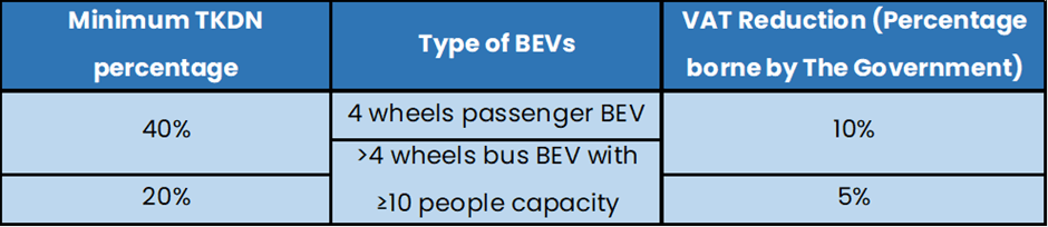 Das Industrieministerium legt als Anforderung fest, dass lokal hergestellte Komponenten für die BEVs genutzt werden müssen. Um von der Mehrwertsteuerermäßigung zu profitieren, sollte ein Unternehmen zwei Steuererklärungen (faktur pajak) ausstellen: eine für den von der Regierung übernommenen Betrag und eine für den verbleibenden MwSt-Betrag. Ein Beispiel für die Berechnung der MwST in der Steuererklärung findet sich im Anhang der Verordnung.