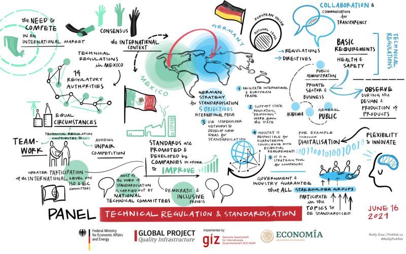 Alfonso Guati Rojo Sánchez erklärte, dass in Mexiko offizielle technische Regulierungen (Normas Oficiales Mexicanas, NOM) existieren. Im Gegensatz zu den freiwilligen mexikanischen Normen (Normas Mexicanas, NMX), sind NOMs verpflichtend für alle Akteure. Sie werden von Regulierungsbehörden herausgegeben. Interessierte Parteien können an ihrer Erstellung mitwirken und technische Unterstützung leisten. NOMs dienen dem Schutz öffentlicher Interessen und tragen so zum Gesundheitsschutz, Schutz für Verbraucher*innen, Lebensmittelsicherheit, Bildung und Kultur, Umweltschutz und öffentliche Arbeiten und Dienstleistungen bei.