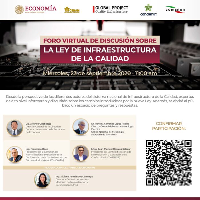 Am 23. September von 11:00 bis 13:00 Uhr (mexikanischer Zeit, UTC -5) / 18:00 bis 20:00 Uhr (deutscher Zeit, UTC +2) findet das virtuelle Forum zur Diskussion über das neue Qualitätsinfrastrukturgesetz in Mexiko statt.